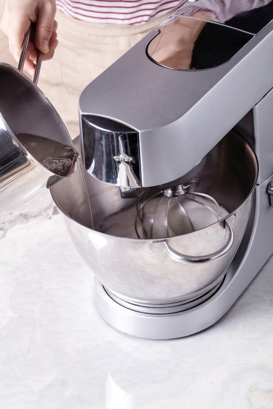 Toz şeker ve su karışımı 118 dereceye ulaştığında ocaktan alın. Yumurta akını çırpmaya devam ederek şekerli karışımı az az ilave edin. Ilkin oldukca sıcak olan çırpma kabı, oda sıcaklığında hissedilene kadar yüksek hızda çırpmaya devam edin.