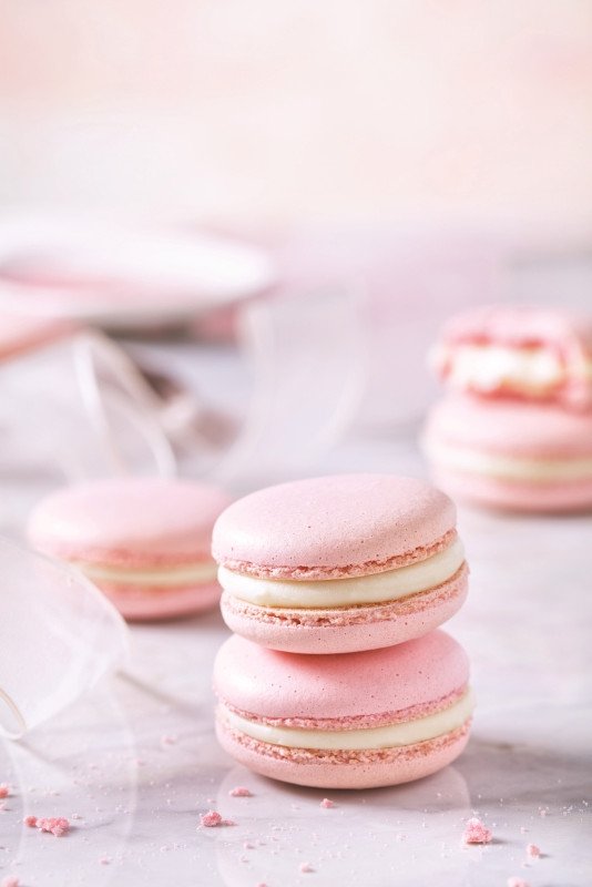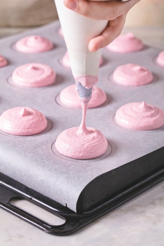 Merengin tamamı bitince kenara alın. Pişirme kağıdını tepsinizin boyutuna gore kati. Üstüne çay bardağı yardımıyla 2-3 santimetre’lik aralıklar bırakarak yuvarlaklar çizin. Pişirme kağıdını siniye yerleştirin. Makaron harcını yuvarlak uçlu bir sıkma torbasına koyun. Yuvarlakların içini doldurana kadar dik bir halde tutarak torbayı sıkın. Tepsiyi her yönden sert bir yüzeye vurun.