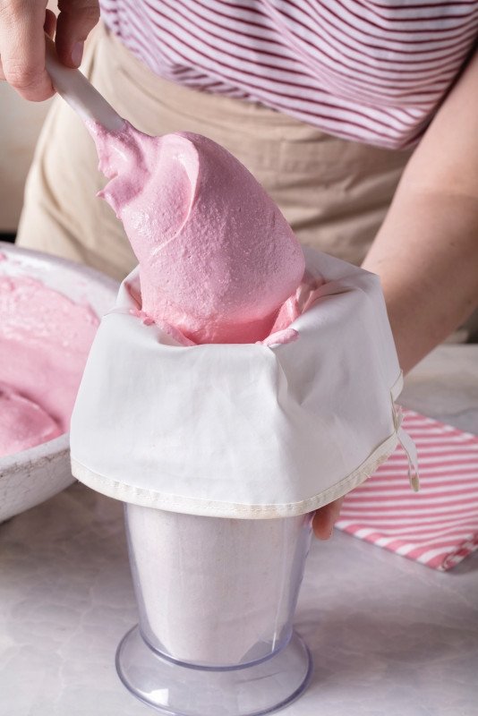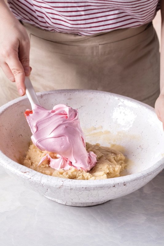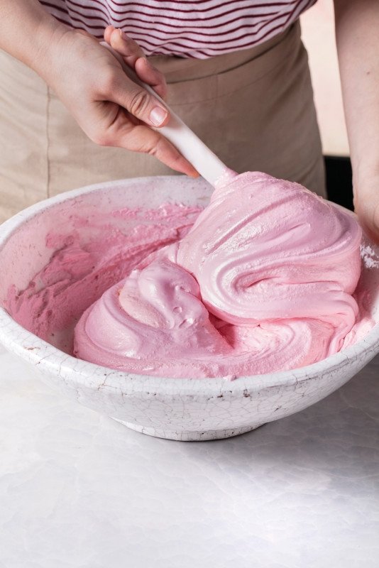 Besin boyası ekleyip iyice çırpın. Karışım oda sıcaklığına gelip mikserin telini kaldırdığınızda şeklini koruyorsa ve parlak bir görünüme sahipse ideal kıvamda anlama gelir. Çırpma işlemini sonlandırıp merengi kenara alın.
