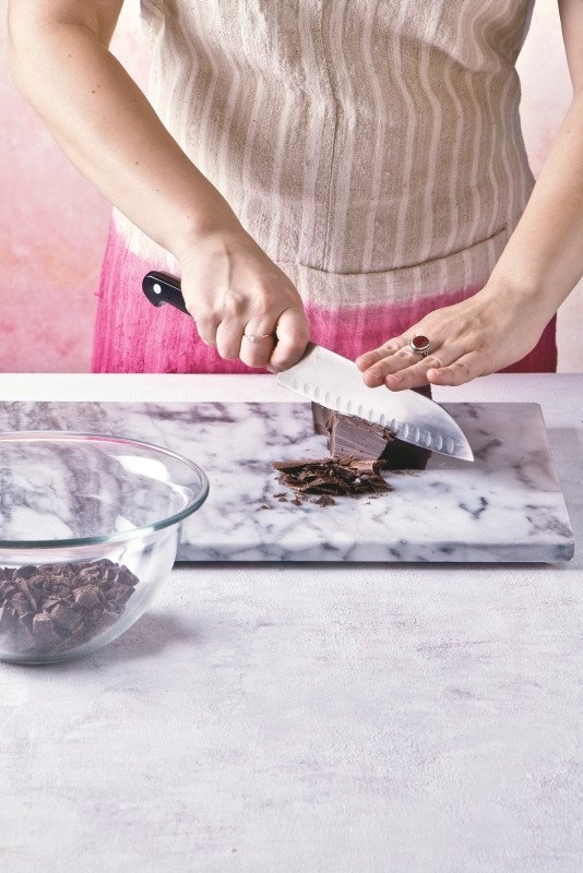 Kuvertür çikolatayı bıçakla ince kıyın. Kıydığınız çikolataları derin bir cam kaseye alın.
