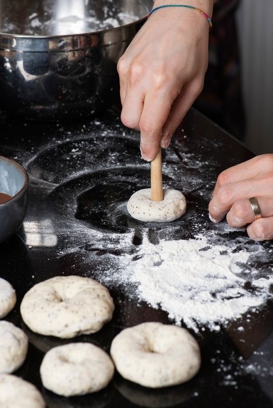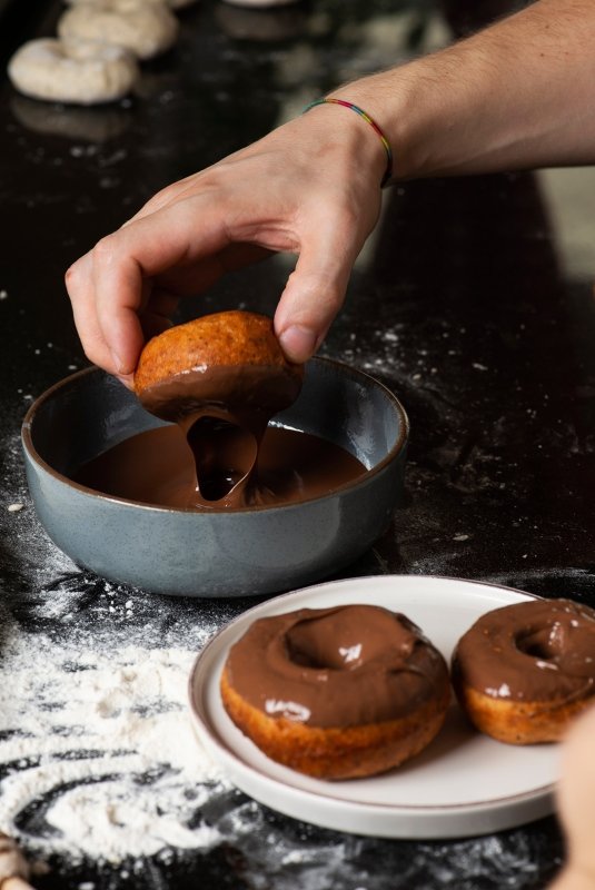 Mayalanan hamurdan arzu ettiğiniz büyüklükte parçalar koparın ve elinizde yuvarlayın. Ortalarına ahşap kaşık sapı yada bal kaşığının sapı ile delik açın. Kızgın yağda önlü arkalı kızartın. Eritilmiş çikolataya batırarak servis yapın.