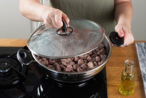 Tencerenin kapağını kapatın. Kapağı açmadan arada bir sallayarak ve hiç su eklemeden kendi suyunda et yumuşayana dek pişirin