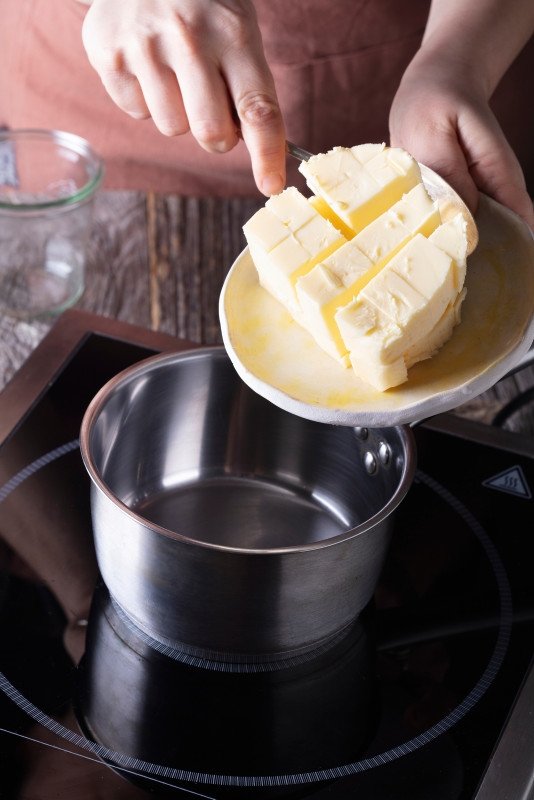 Tereyağını sos tenceresine alın. Orta ısıda eritin. Erime esnasında üstünde oluşan köpüğün tamamını başka bir kaba alın. Üstünde asla köpük kalmamalı. Köpük bitince, kısık ısıda süt bileşenlerinin dibe çökmesini ve kahverengileşmesini bekleyin. Rengi koyulaşınca kazandığınız yağı tülbent yardımı ile süzgeçten geçirin. Süzdüğünüz yağı oda ısısında yada buzdolabında muhafaza ederek tüketebilirsiniz.