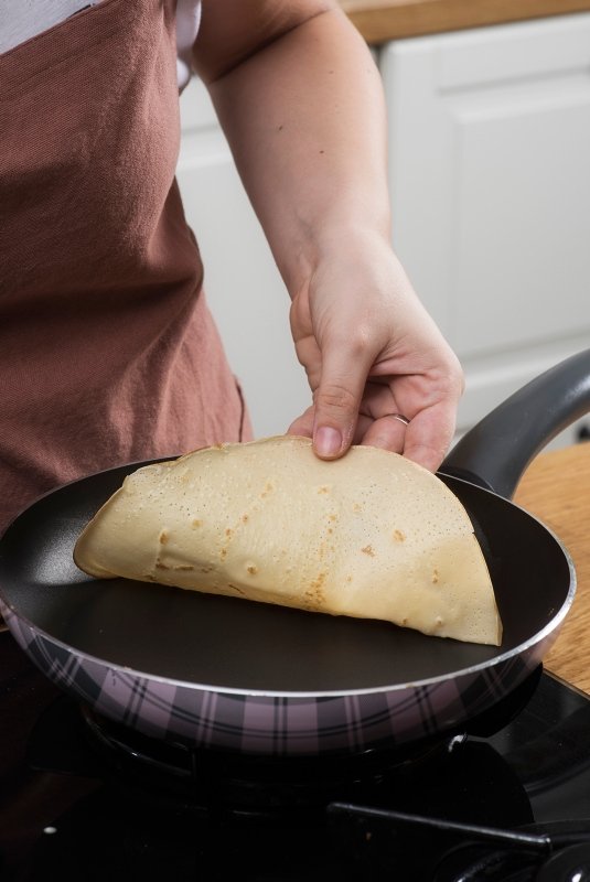 Krep harcından 1 kepçe alıp, eğik tuttuğunuz tavanın ortasına dökün. Tavayı kendi ekseninde hızla döndürüp harcı ince olacak şekilde gösterim. Üstünde baloncuklar oluşmaya başladığında çevirin ve öteki tarafını pişirin. Her 3 krepten sonrasında tavayı yağlayarak işleme devam edin.