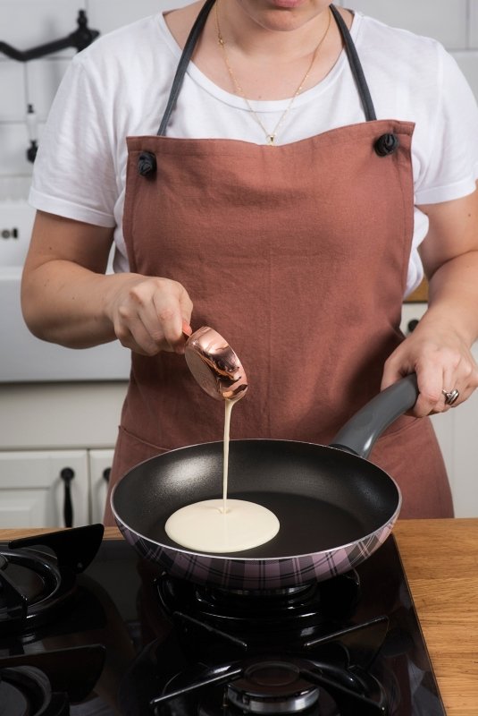 Tüm hamur harcı malzemesini geniş bir kaseye alın. Tamamen pürüzsüz bir kıvam alana dek iyice çırpın ve minimum 1 saat buzdolabında beklemeye alın. Orta boy yapışmaz yüzeyli bir tavayı orta ateşte ısıtıp. 1 çay kaşığı tereyağını içine koyun ve fırça ile her tarafına iyice sürün.